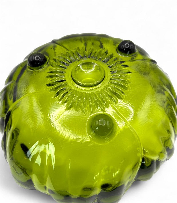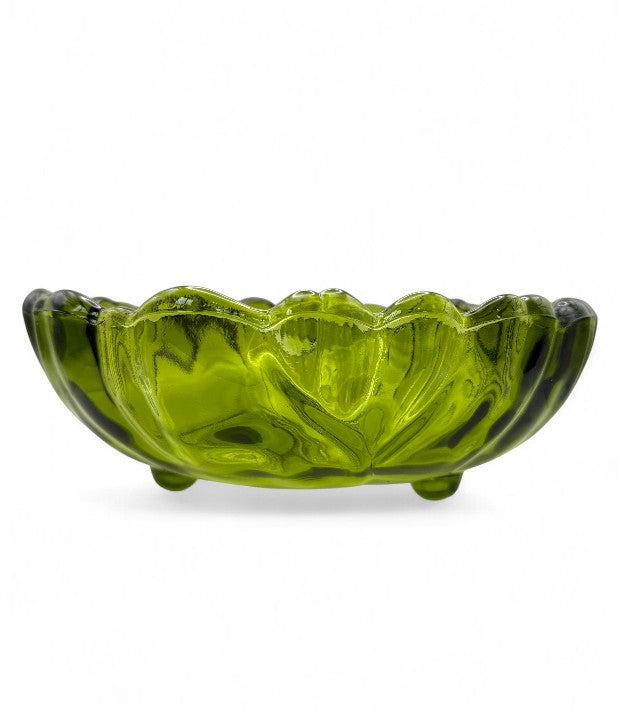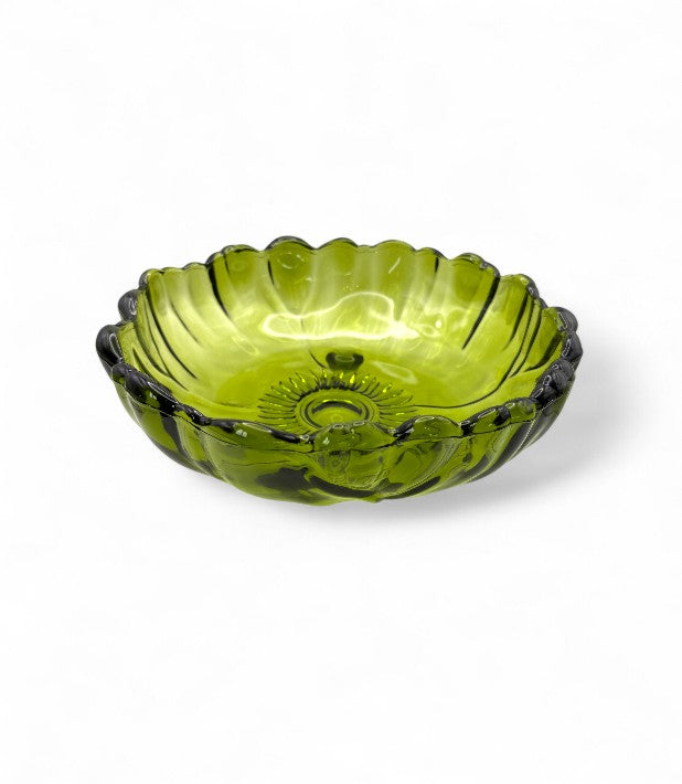 Brighten your table with this vintage 1970s Indiana Glass footed serving bowl in bold green. Featuring a sunflower-inspired design at the center, scalloped edges, and a sturdy footed base, this versatile piece works beautifully as a fruit bowl, centerpiece, or serving dish. A true retro classic that blends functionality with vibrant mid-century style.