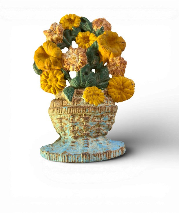 This is the kind of antique that makes a room look finished even if the laundry pile says otherwise. A classic early-20th-century cast iron doorstop in a cheerful flower basket form, with that irresistible timeworn paint: golden yellow blooms, deep green leaves, and a soft turquoise base with plenty of honest patina.