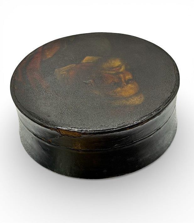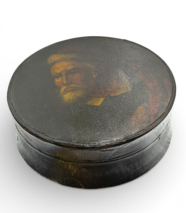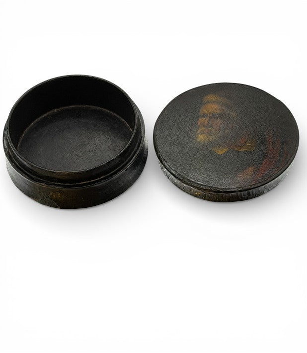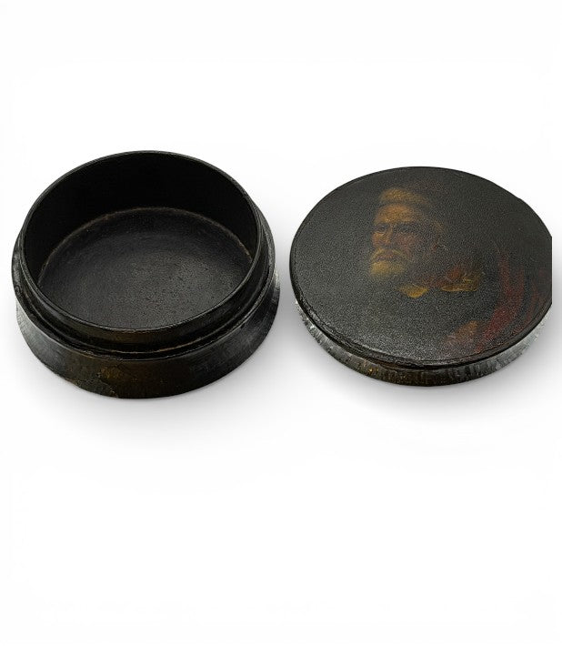Antique Lacquer Snuff Box — Hand-Painted Gentleman Portrait (Round Lidded Box)
