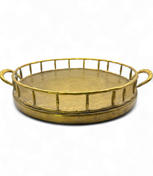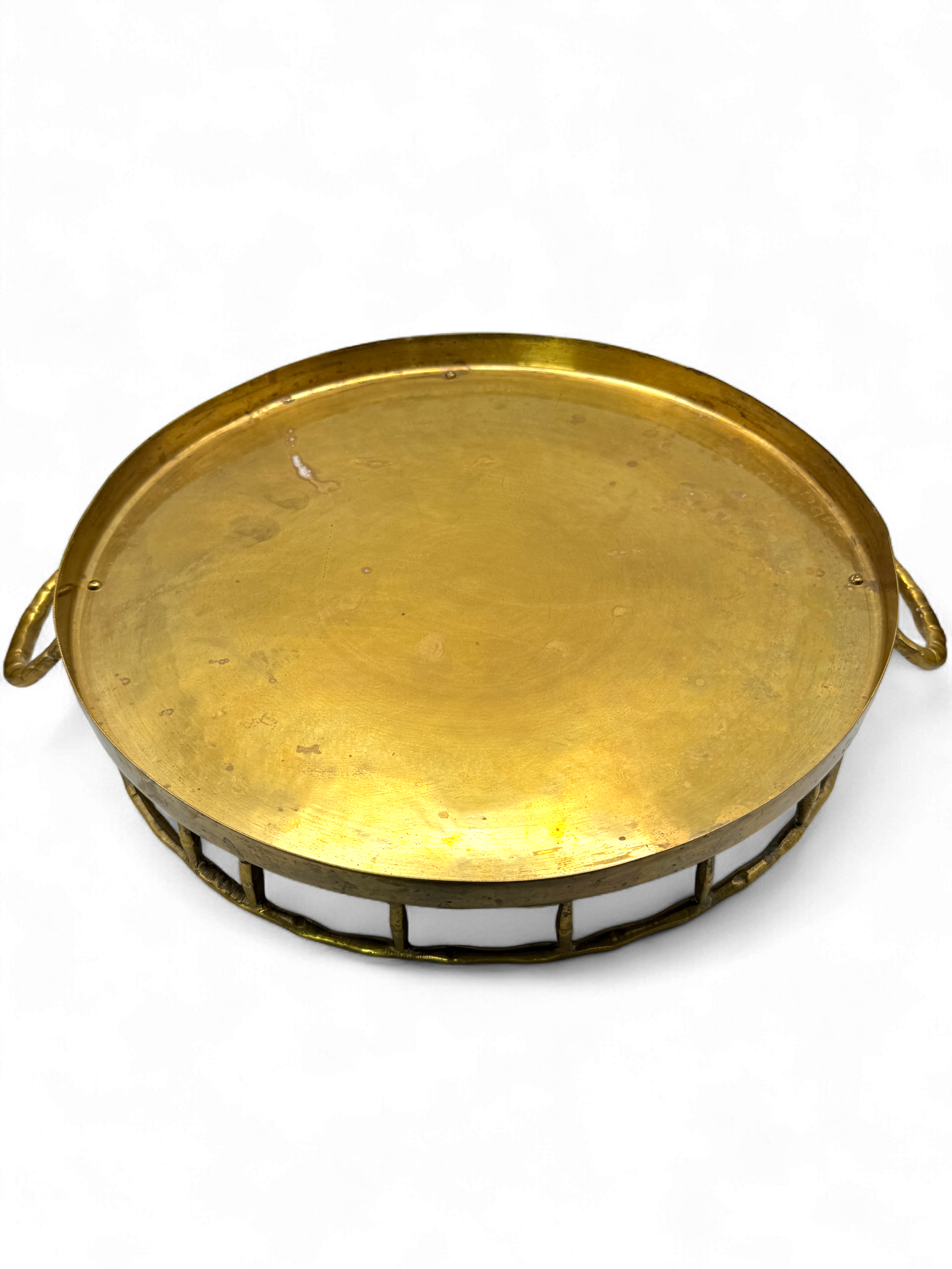This striking vintage serving tray captures the timeless glamour of the Hollywood Regency era. Crafted from solid brass, it features elegant faux bamboo handles and a raised gallery edge—both adding a touch of sophistication and function. The warm golden patina has aged beautifully, giving the piece a soft, lived-in glow that only comes with time.